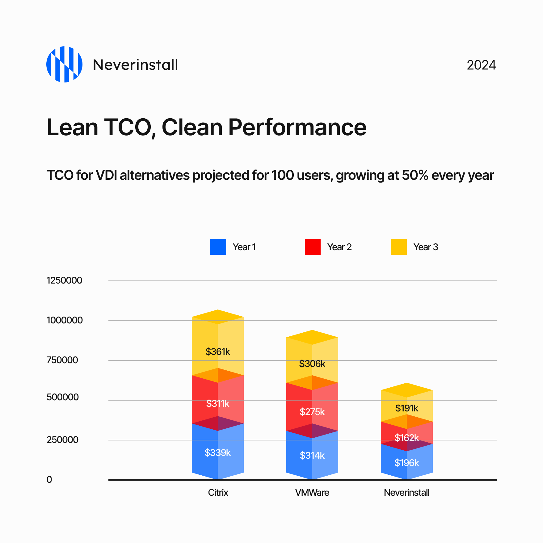 In this blog, we offer a comprehensive guide to understanding and defining TCO for your VDI options, and how differentiated engineering can enhance cost efficiency. Here we are also introducing Neverinstall as an alternative to Citrix and VMWare offering a 46% higher cost-efficiency that enhances performance without sacrificing quality.