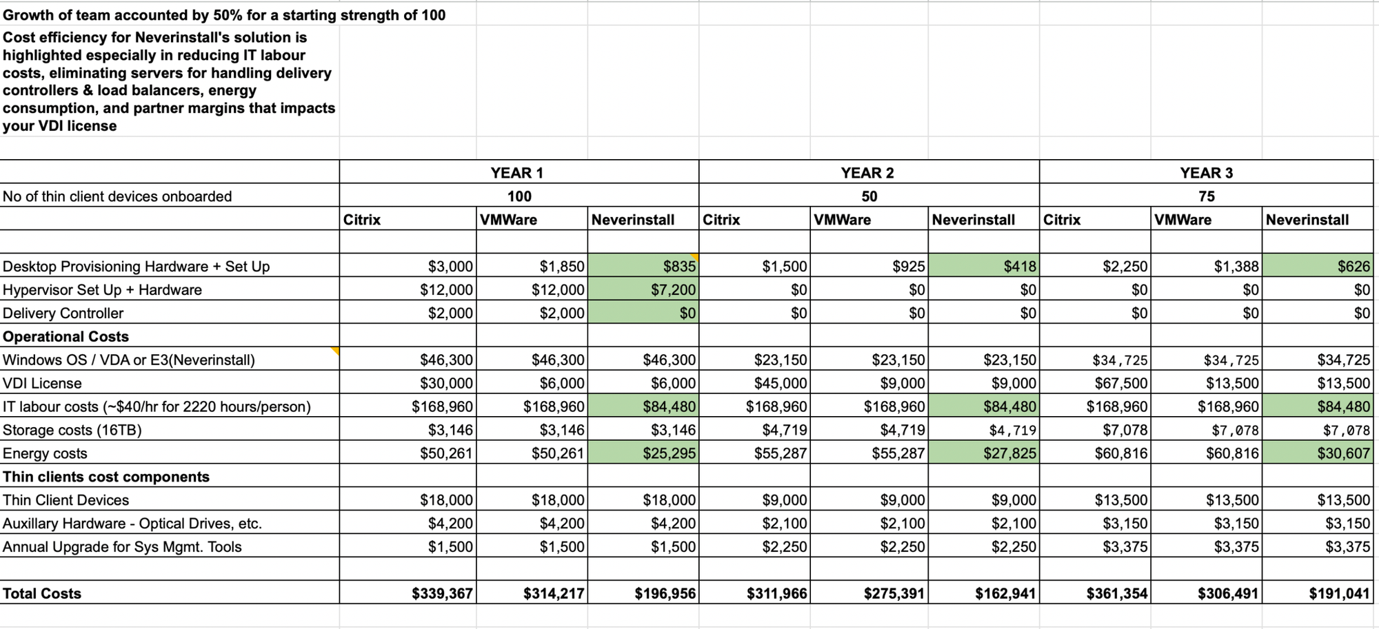 - Over three years, Neverinstall results in total cost savings of 45.6% compared to Citrix ($550,938 for Neverinstall vs. $1,012,687 for Citrix) and 38.5% compared to VMWare ($550,938 for Neverinstall vs. $896,099 for VMWare).