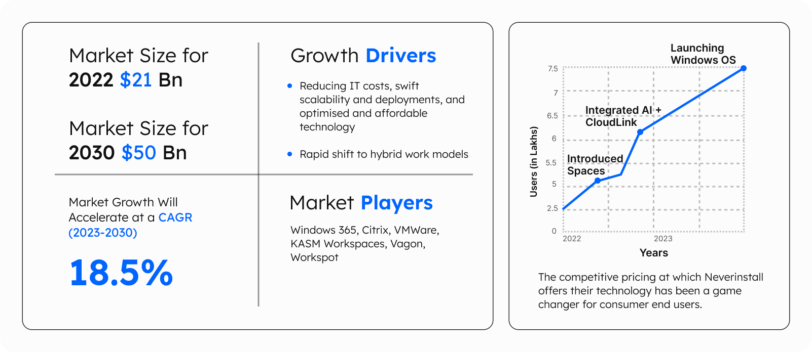 On the other hand, Neverinstall brings an engineered difference in the cloud PC world with deploying virtual desktops instantly, or reducing the technical expertise and the overheads involved in maintaining virtual desktop solutions for businesses, all by virtue of a modernised architecture.