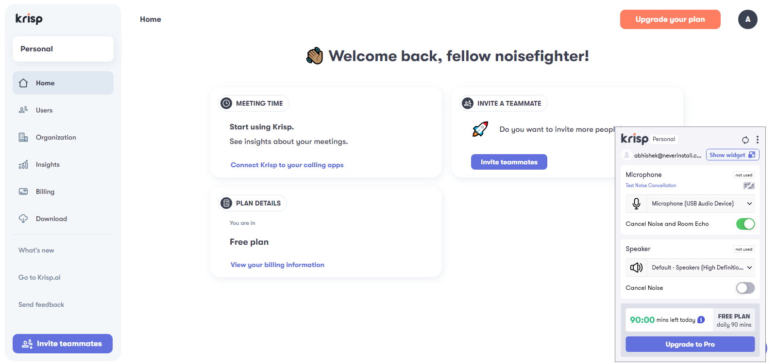 Krisp is an intuitive tool that helps users improve voice communication over the internet. While remote work offers many advantages, employees cannot always control the environment around them. For example, working from home, they won't be able to control or reduce noises around them - stress traffic, baby crying, cooking noise, neighbors fighting, etc.