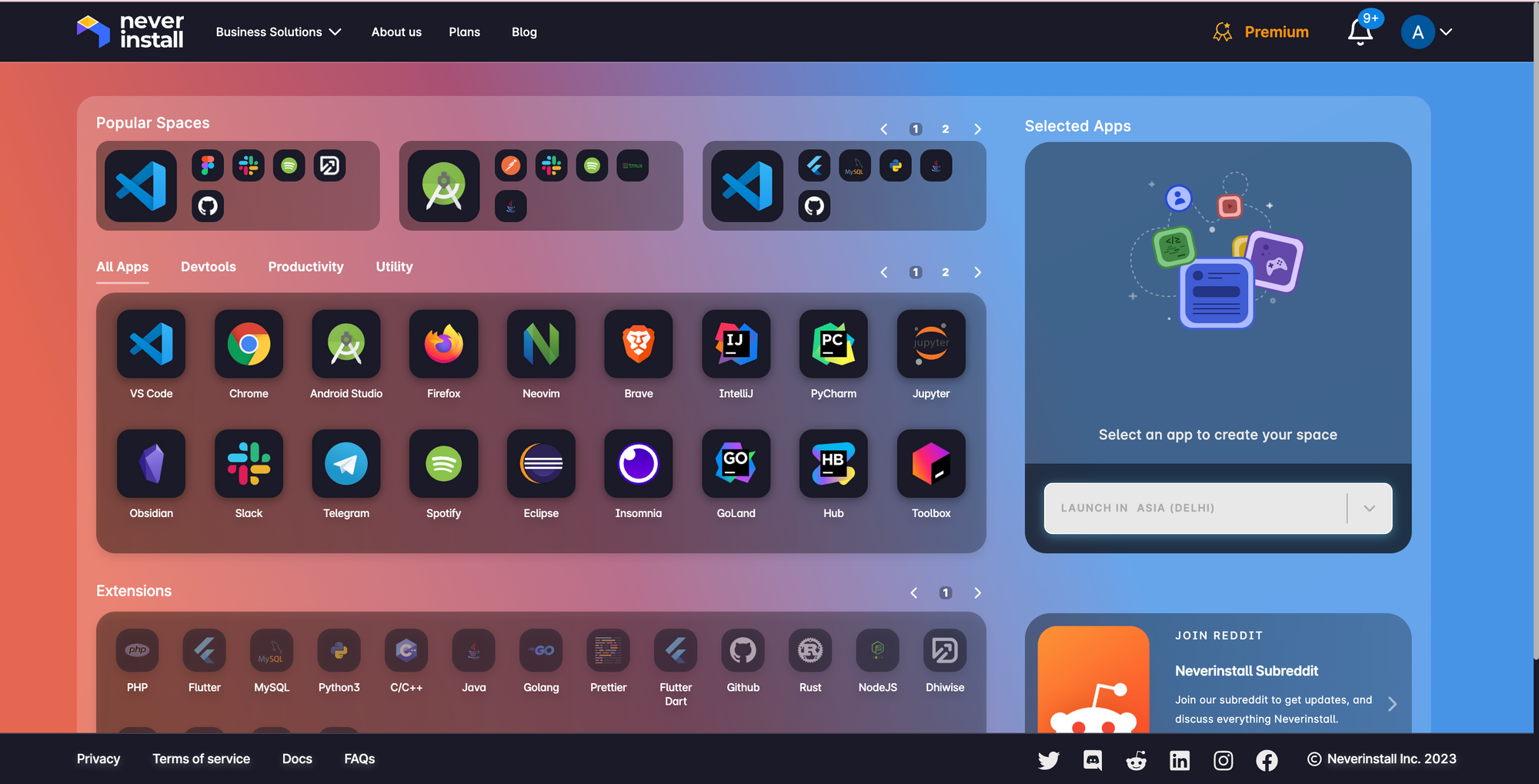 Moreover, we handle all the heavy lifting of launching these apps over the cloud for super-fast processing, compilation, and build times. You can launch all these apps via servers in Europe or the USA, thus getting highly accelerated internet speeds with a few clicks. Create a Space and experience Neverinstall today!