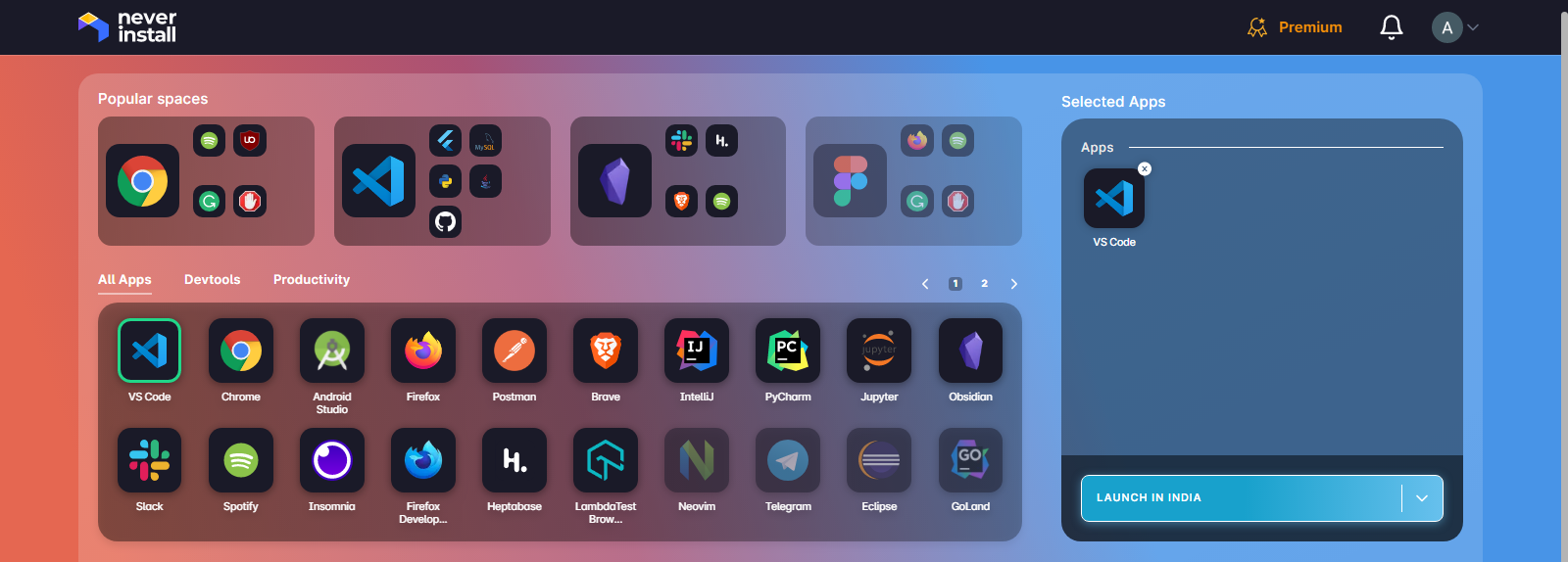 Simply select the tools you want, launch a Space, and Neverinstall will trigger a Linux desktop with your selected apps prepped for immediate usage. In other words, you never have to download or configure any tools, including the dev tools. Needless to say, the heavy lifting required to run these applications is handled by our remote servers, freeing your device from sluggish performance. All your local device needs to do is log in to Neverinstall through a browser.