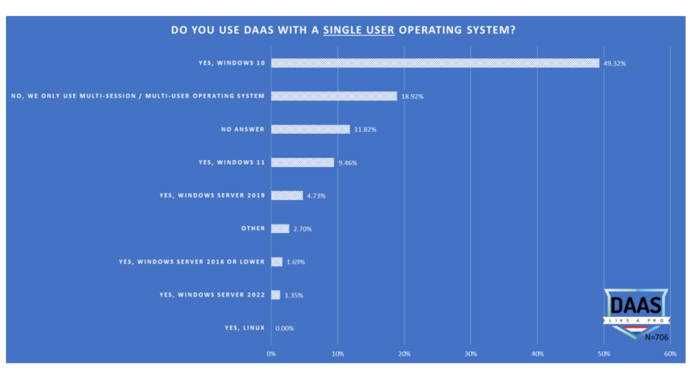 According to DaaS like a Pro's latest survey of 2023, the trends are pointed towards increased use of Windows 10 and Windows Server 2019/20 Virtual Desktops in the coming years, mostly due to their familiar environments, and the range of applications available within the Microsoft environment.